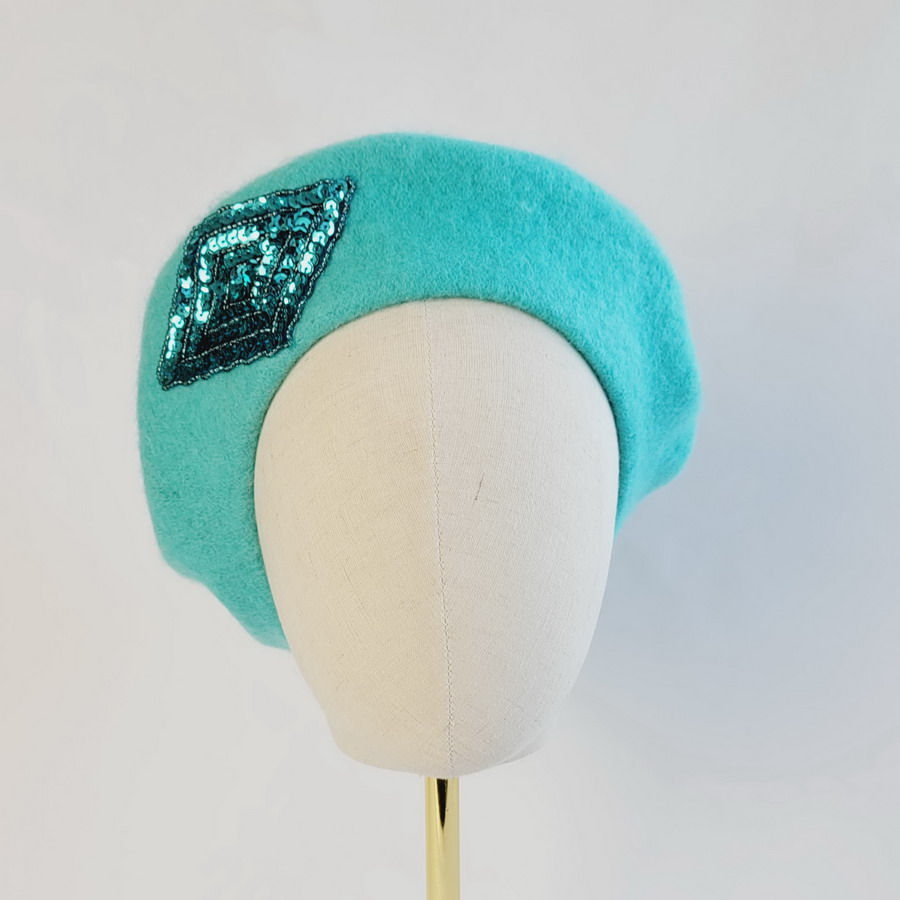 Duck egg blue wool felt beret decorated with a handsewn turquoise sequin motif.