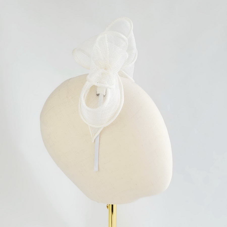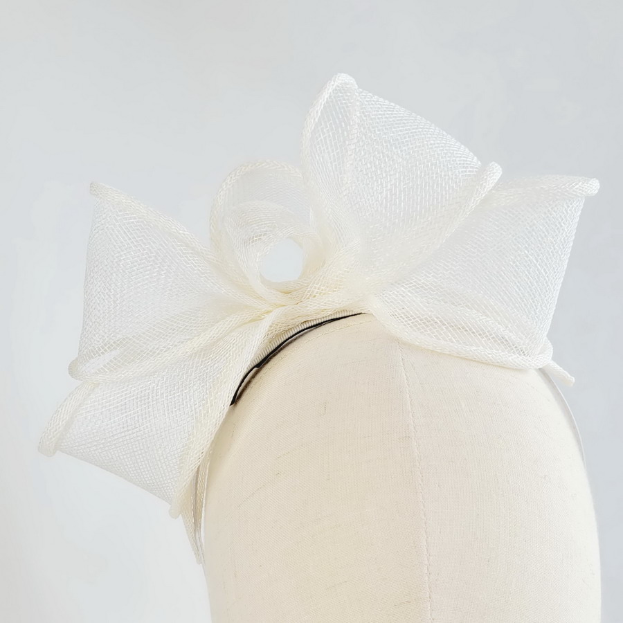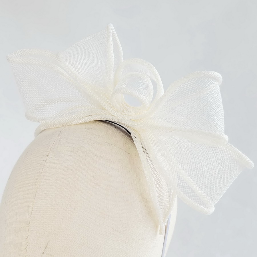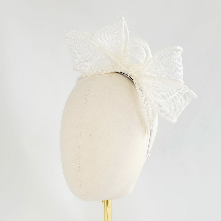 This bright white sinamay looped fascinator can be worn to the left or right of the head. If you aren’t sure which side to wear it, I would recommend wearing it on the same side as your parting.