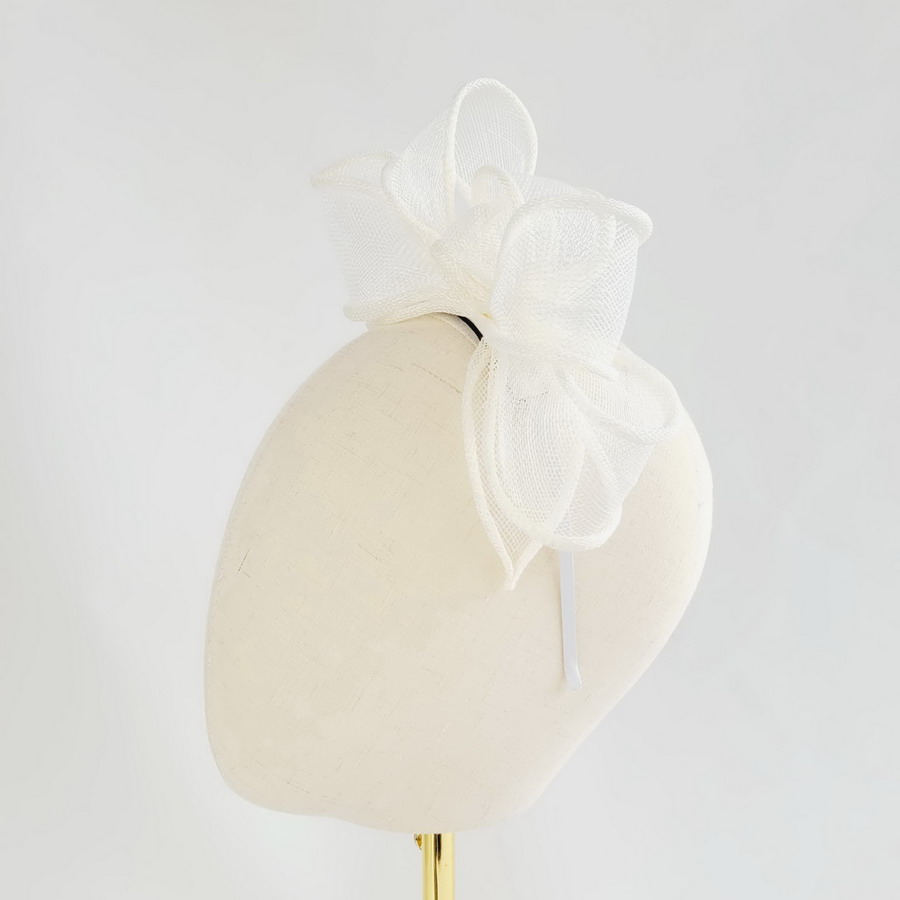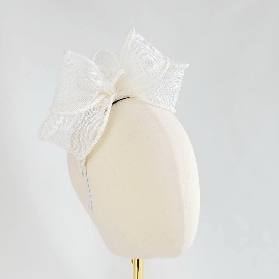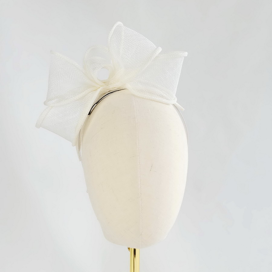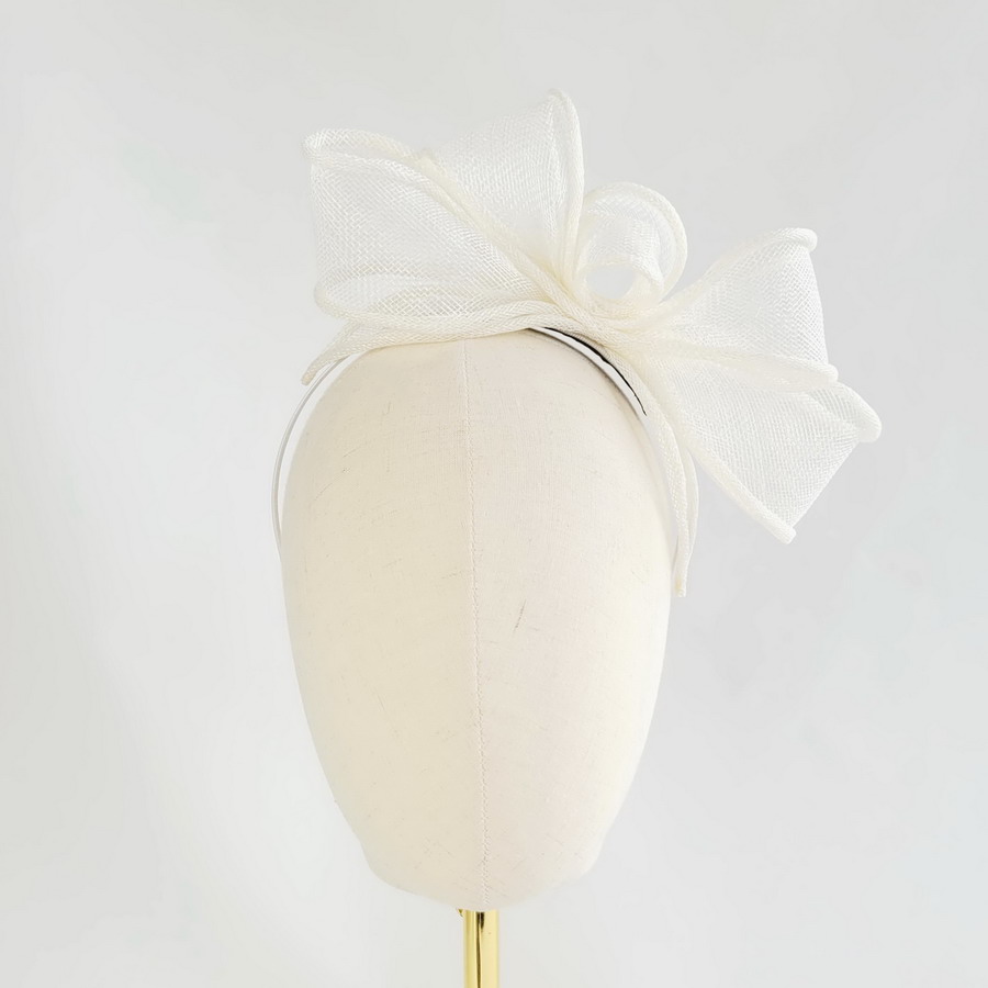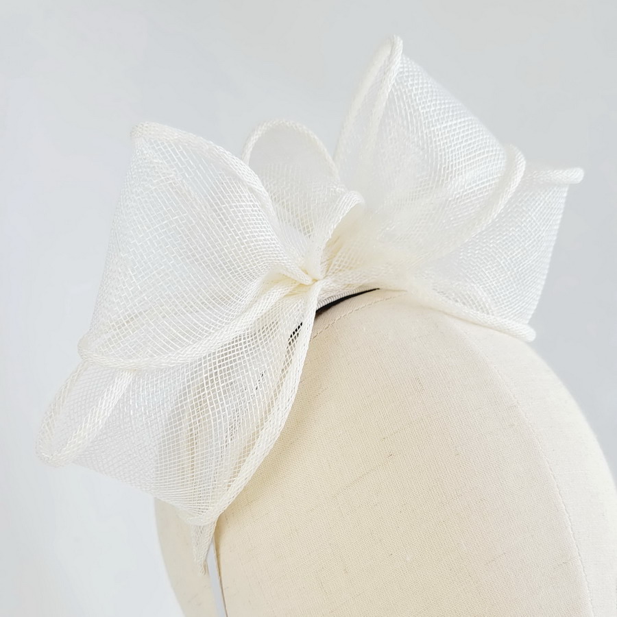 This bright white sinamay looped fascinator can be worn to the left or right of the head. If you aren’t sure which side to wear it, I would recommend wearing it on the same side as your parting.
