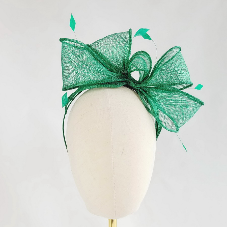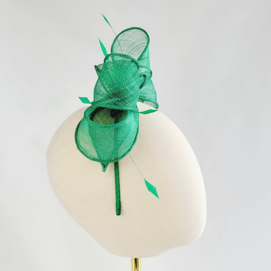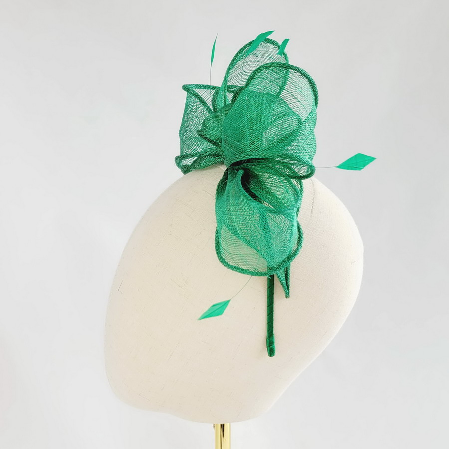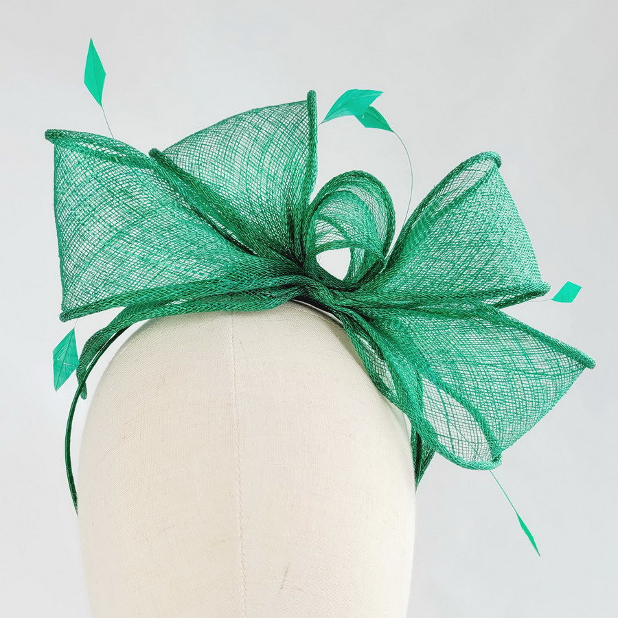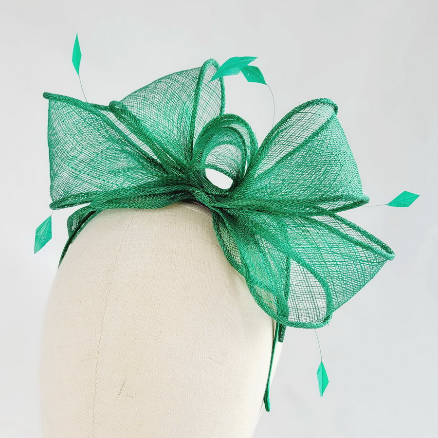 This emerald green sinamay loop fascinator, finished with hand-cut coque feathers, is a classic wedding fascinator.