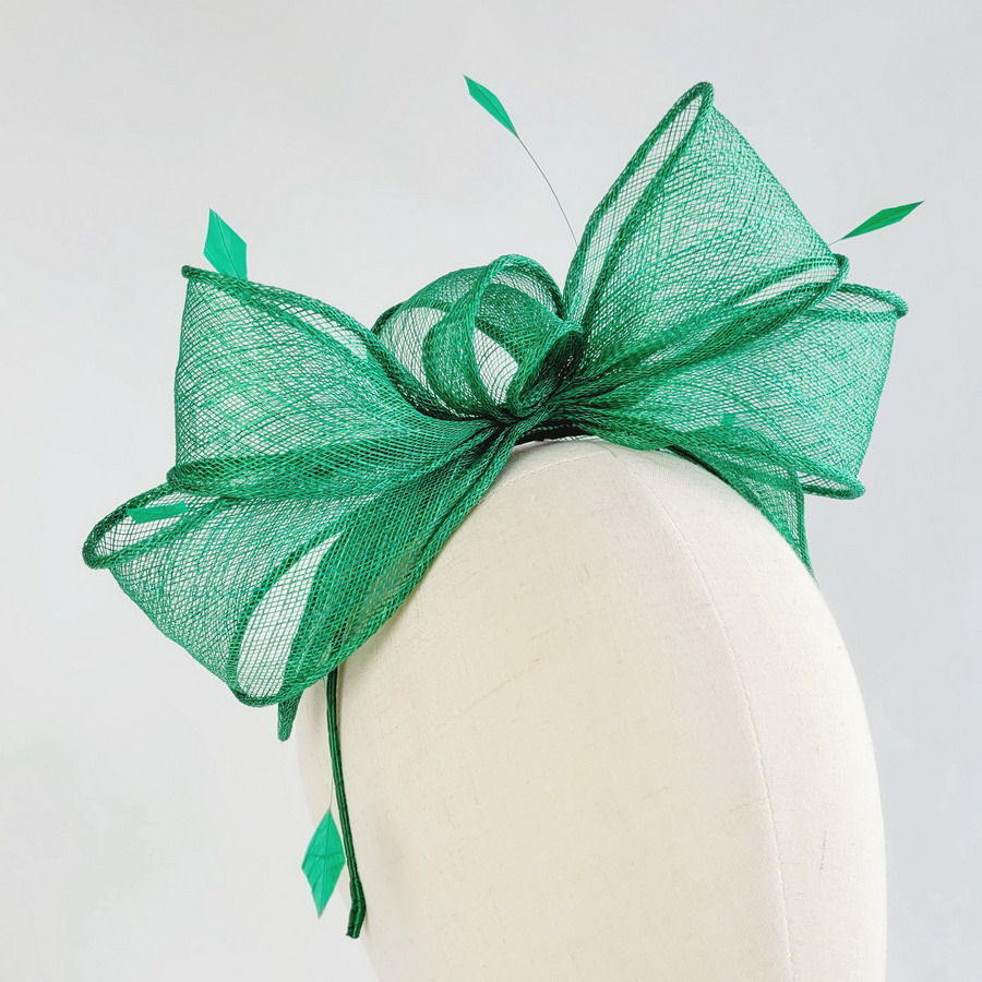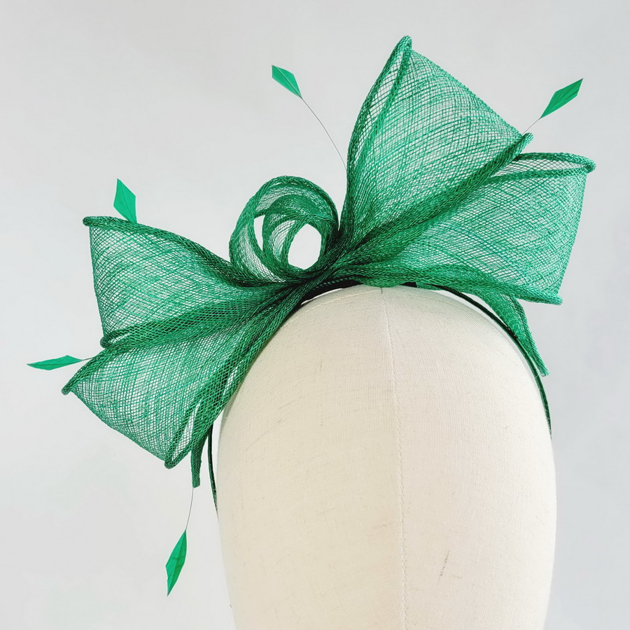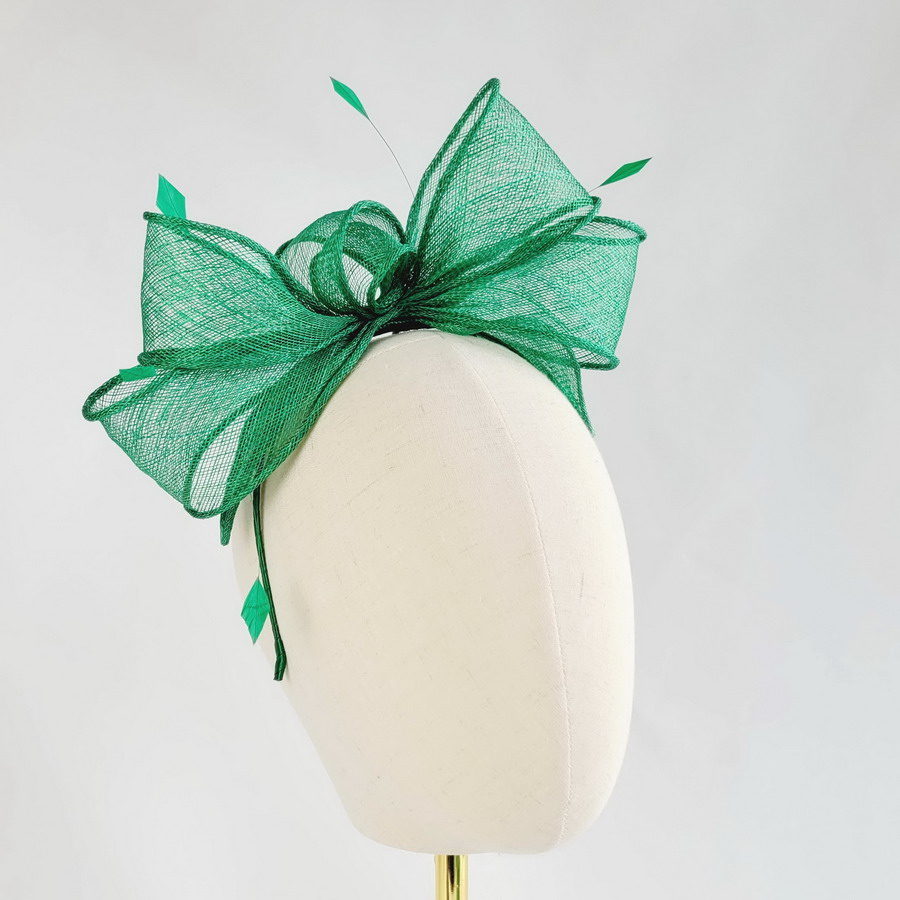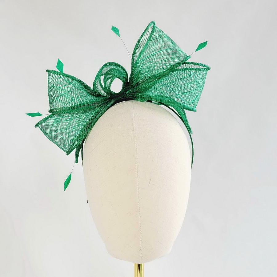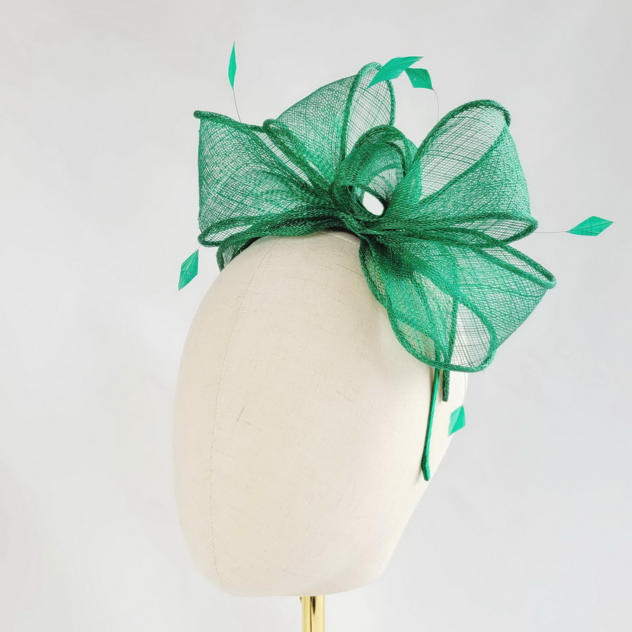 This emerald green sinamay loop fascinator, finished with hand-cut coque feathers, is a classic wedding fascinator.